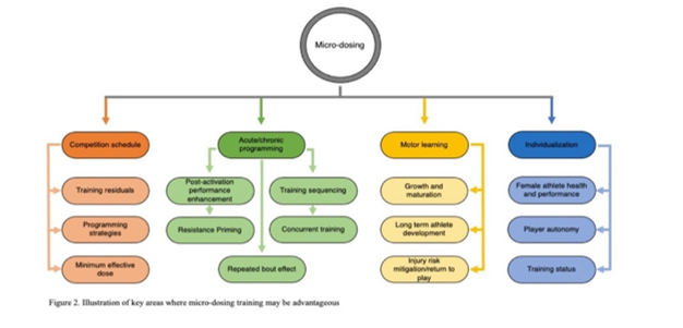 El microdosing ha emergido en los últimos años como una estrategia de gran valor para integrar el trabajo de fuerza en calendarios competitivos cada vez más exigentes. Se trata de intervenciones breves, específicas y frecuentes, distribuidas estratégicamente a lo largo de la semana, con el objetivo de mantener o desarrollar la fuerza sin interferir con las demandas técnicas o tácticas propias del deporte (Afonso et al., 2022; Cuthbert et al., 2024). En este sentido, el microdosing no busca reducir la carga total, sino redistribuirla en sesiones más cortas y frecuentes, logrando continuidad y disponibilidad del jugador. Derek M. Hansen —quien introdujo el término en el fútbol a mediados de la década de 2010. Buscaba una estructura que le permita mantener el nivel de intensidad técnico táctica y su vez continuar entrenando la velocidad máxima en sus futbolistas. Existe un ajuste terminológico el cual propone llamar el atermino como micro-priming, destacando el carácter de preparación y optimización de estos estímulos, más allá de la idea farmacológica asociada a la palabra “dosis”.