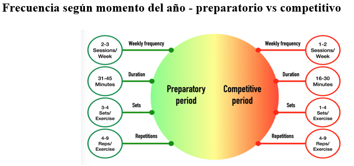 En la fase preparatoria se busca un estímulo más amplio y sostenido para generar adaptaciones estructurales y neuromusculares. Un tipo de frecuencia recomendada es de 2 a 3 sesiones semanales, con una duración de 31 a 45 minutos por unidad. El volumen se organiza en 3 a 4 series por ejercicio o superior y un rango de 4 a 9 repeticiones, lo cual permite trabajar tanto la fuerza máxima como la potencia, manteniendo un balance entre intensidad y volumen. Esta estructura favorece el desarrollo progresivo, la acumulación de cargas y la preparación del jugador para soportar posteriormente la densidad competitiva.