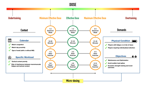 En línea con la distinción entre el periodo preparatorio y el competitivo, la microdosificación permite ajustar la carga a través de diferentes niveles de dosis. Durante fases de mayor disponibilidad, como la pretemporada o bloques de desarrollo físico, puede aplicarse una dosis máxima efectiva, caracterizada por mayores volúmenes e intensidad para favorecer adaptaciones estructurales profundas. En cambio, en semanas estables de entrenamiento la dosis efectiva representa el punto óptimo, ya que maximiza la fuerza y potencia sin superar la capacidad de recuperación. Finalmente, en contextos de alta congestión de partidos, tapering o retorno a la competición, la dosis mínima efectiva se convierte en la mejor estrategia para mantener la función neuromuscular sin comprometer la disponibilidad del jugador, consolidando así la flexibilidad del microdosing como herramienta de planificación.