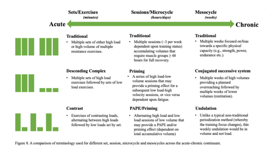 Para comprender cómo se organizan los distintos métodos de entrenamiento dentro del marco de la microdosificación, es útil observar el continuum agudo-crónico. En el extremo más inmediato, se ubican estrategias agudas aplicadas en una sola sesión, como el método tradicional, el descending complex o el contraste, todas centradas en el uso de cargas altas o la alternancia entre intensidades. A nivel de microciclo, aparecen opciones como el priming y el PAPE, que distribuyen sesiones breves y específicas a lo largo de la semana para potenciar el rendimiento sin necesidad de acumular grandes volúmenes. Finalmente, cuando se avanza hacia el mesociclo, entran en juego métodos de periodización más amplios, como los bloques tradicionales, el sistema conjugado sucesivo o la undulación, que buscan consolidar adaptaciones estructurales a lo largo de varias semanas. Este recorrido muestra cómo lo agudo y lo crónico se enlazan, y cómo el microdosing actúa como un puente eficaz entre lo inmediato y lo planificado.